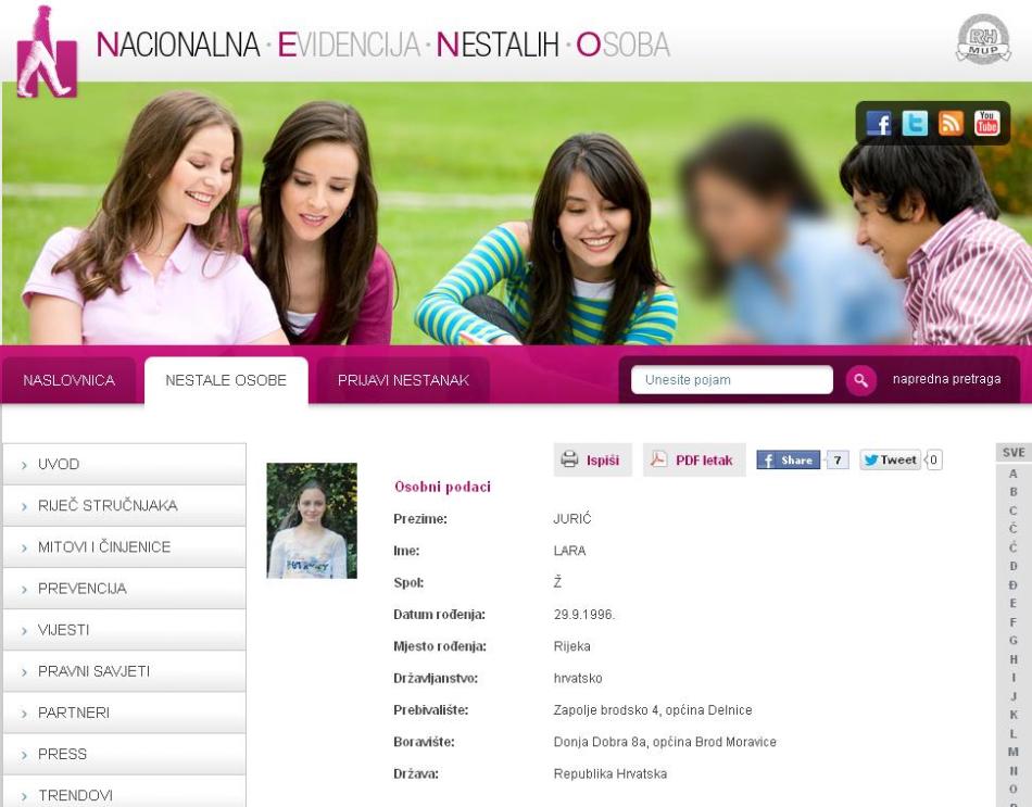 Policija posebnu pažnju skreće na činjenicu da sve korisne podatke o nestalim osobama prvenstveno treba javiti u najbližu policijsku postaju, na broj 192 ili u službeni profil nestale osobe u Nacionalnoj evidenciji nestalih osoba http://nestali.hr/default.aspx nije preporučljivo podatke dostavljati izravno članovima obitelji jer se ionako trebaju službeno provjeriti!