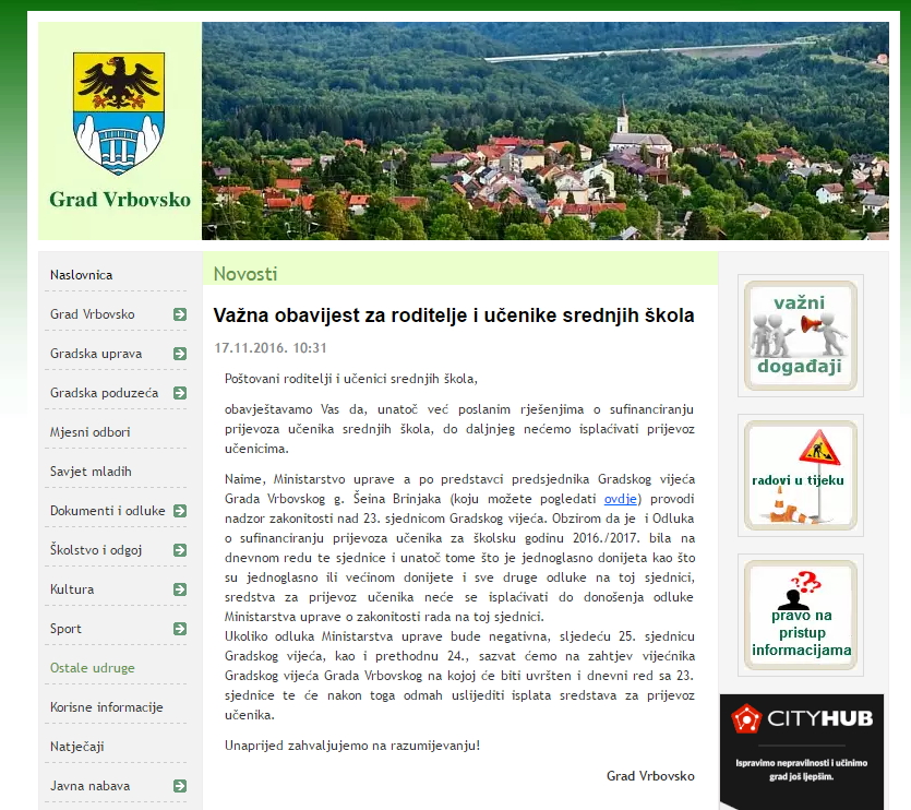 VRBOVSKO – Na službenim stranicama Grada Vrbovskog objavljena je dramatična obavijest roditeljima osnovaca i srednjoškolaca putnika da do daljnjeg ne očekuju novac za sufinanciranje prijevoza. Kako stoji u obavijesti, koju potpisuje Grad Vrbovsko, krivac za to nije manjak u gradskoj kasi ili ukidanje prava nego ni manje ni više nego predsjednik Gradskog vijeća Šein Brinjak. Naime, predsjednik Gradskog vijeća Brinjak Ministarstvu uprave prijavio je onu famoznu nelegalnu sjednicu Gradskog vijeća nad kojom se sada provodi nadzor njene zakonitosti a na kojoj se između ostalog donosila i Odluka o sufinanciranju prijevoza učenika za školsku godinu 2016./2017. Budući da se sjednica preispituje sve odluke donešene na njoj su „zaleđene“ pa tako i sredstva za prijevoz učenika neće se isplaćivati do donošenja odluke Ministarstva uprave o zakonitosti rada na toj sjednici. Tako sročena obavijest može se i iščitati i kao drugi čin obračuna gradonačelnika Dražena Mufića sa predsjednikom Gradskog vijeća Brinjakom. Onaj prvi bio je demonstriran oduzimanjem Brinjakovih funkcija u gradskim odborima a ovaj drugi je već svojevrsni poziv na javni linč. Prozivati Brinjaka da je krivac jer se neće isplatiti novac učenicima putnicima je apsolutno besmisleno jer su za preispitivanje zakonitosti sporne sjednice krivci oni koji su je sazvali odnosno gradske službe koje su se koristile Brinjakovim potpisom bez njegova dopuštenja. Jedini razlozi ovakvog obračuna gradonačelnika je bojazan od porasti popularnosti Brinjaka među građanima nakon odupiranja apsolutizmu beskompromisnim inzistiranjem na zakonskom radu Gradskog vijeća.