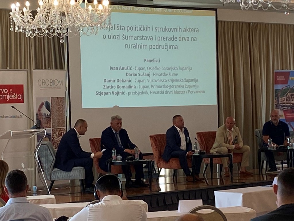Gorski kotar je zeleno srce Hrvatske i ima ogromna količina drvne mase koja se eksploatira čak i više od mogućnosti prirodnog oporavka naših šuma. Tražimo da se zaustavi izvoz trupaca, jer i zakon kaže da se trupci mogu sjeći samo za obradu u Hrvatskoj, no nažalost svjedočimo da nije tako, izjavio je župan Komadina. Druga je stvar što je struktura naše drvne industrije uglavnom piljena građa, a malo finalnog proizvoda. Oko 4 posto prihoda PGŽ čini drvna industrija a 8 posto izvoza.