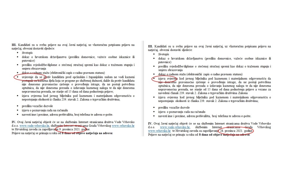 Prvi natječaj (lijevo) i drugi natječaj (desno). Jedna riječ mjenja sve – uzmjesto uvjerenja dovoljna je izjava
