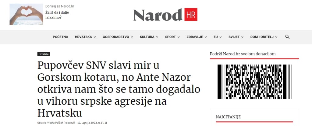 Uz suzdržanog Mufića kritički su na obljetnicu reagirali na portalu Narod.hr. Tjedan dana poslije, a prije dva dana, na tu temu obilježavanja obljetnice portal Narod.hr, razgovarao je s izv. prof., dr. sc. Antom Nazorom, ravnateljem Hrvatskog memorijalno-dokumentacijskog centra Domovinskog rata. U tekstu pod naslovom Pupovčev SNV slavi mir u Gorskom kotaru, no Ante Nazor otkriva nam što se tamo događalo u vihoru srpske agresije na Hrvatsku, autorice Vlatke Polšak Palatinuš istaknuto je da SNV slavi postizanje dogovora koji zapravo obilježava predaju dijela oružja pripadnika srpske nacionalne manjine koje se dogodilo tek u ljeto 1992. i to kada je već bilo jasno da se JNA zajedno s domaćim pobunjenicima, neće moći probiti do Gorskog kotara i spojiti ga s tzv. Srpskom Krajinom a u nastavku donosi opširno objašnjenje Ante Nazora zašto se tijekom Domovinskog rata na tom području, za razliku od većine drugih područja na kojima su Srbi živjeli u većem broju, održao mir.
