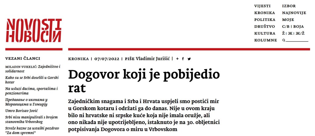 VRBOVSKO – Svečano obilježavanje 30. godišnjice “Dogovora o održanju mira u Gorskom kotaru“ odjeknulo je različitim reakcijama. Bilo je tu oduševljenja, suzdržanosti ali i kritičnosti. O toj velikoj obljetnici u sklopu koje je održan Okrugli stol tjednik Novosti objavio članak pod naslovom Dogovor koji je pobijedio rat, autora Vladimira Jurišića.