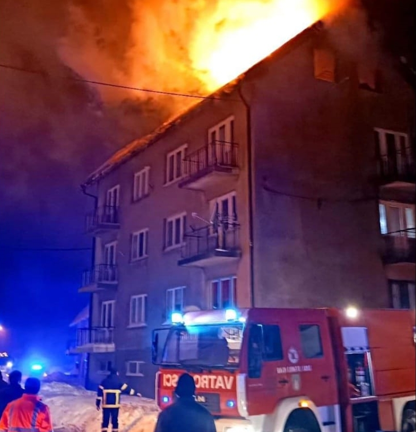 LOKVE – Veliki požar, u noći sa subote na nedjelju, izbio je u potkrovlju više-stambene zgrade u Lokvama. Izgorjela su dva stana i krovište zgrade, ozlijeđenih osoba nije bilo a brzom intervencijom lokalnih vatrogasaca i Javne vatrogasne postrojbe Delnice spriječeno je širenje vatre na ostale stanove. O uzroku požara i nastaloj šteti poslali smo upit Policijskoj upravi primorsko-goranskoj te ćemo odgovor objaviti čim nam odgovore. U međuvremenu se, o toj dramatičnoj situaciji koja je u dva u jutro šokirala Lokvarce, oglasio načelnik Općine Toni Štimac koji je napisao – Tijekom jučerašnje noći došlo je do požara na “Rudnikovoj zgradi”. Izgorio je krov i dva stana u zgradi. Brzom intervencijom naših dečki izDVD Lokve i JVP Delnice spriječila se još veče širenje požara na ostale stanove. Šteta je velika, srećom zgrada je osigurana pa će osiguranje vjerojatno pokriti štetu na krovištu, stanovima i ostalim stanovima uslijed prodora vode. No i uz tu financijsku pomoć sigurno neće biti pokrivene sve štete pa ćemo u sljedećih par dana obavijestiti Vas za sljedeće korake pomoči stanarima zgrade Rudolfa Strohala 134 u Lokvama jer Lokvarci su uvijek imali veliko srce kada treba pomoći. Hvala još jednom nasšim dečkima iz DVD Lokve, JVP Delnice, susjedima koji su istrčali u pomoć susjedima te svima koji su na ovaj ili onaj način pomogli ili htjeli pomoć stanarima. Poruka stanarima uz Vas smo, materijalna pomoć uvijek je nadoknadiva dok ljudski život nije. Zato ne brinite, Lokvarci, prijatelji, susjedi, Gorani, Primorci, Općina Lokve svi su tu za pomoć u najbržem mogućem rok da se zgrada čim prije sanira, stoji u objavi načelnika Lokava, Štimca.