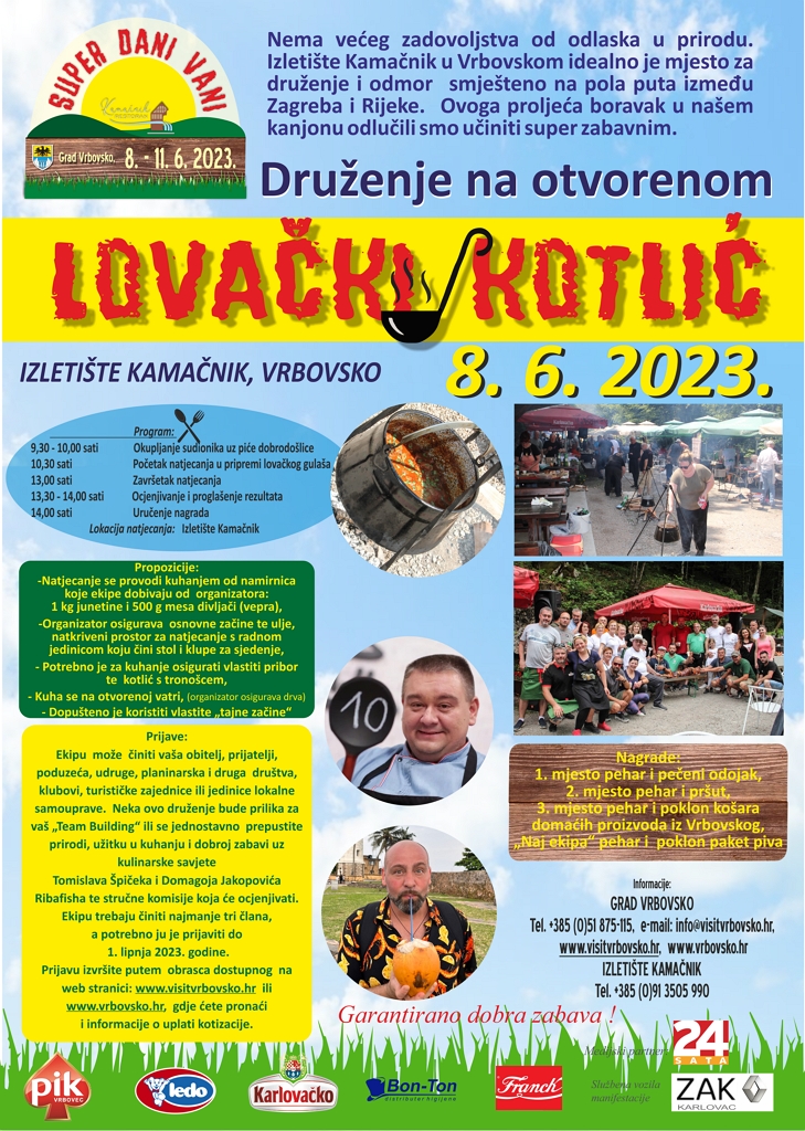 08. lipnja 2023.g. započinju „Super dani vani“ , prvi dan sad već tradicionalnog druženja u izletištu Kamačnik rezerviran je za natjecanje u spravljanju LOVAČKOG KOTLIĆA . I ove godine očekuje vas mnogo dobre zabave, glazba uživo, domaći specijaliteti, šetnja jednim od najljepših hrvatskih kanjona i druženje s poznatim televizijskim kuharom Tomislavom Špičekom te novinarom i blogerom Domagojem Jakopovićem Ribafishem.