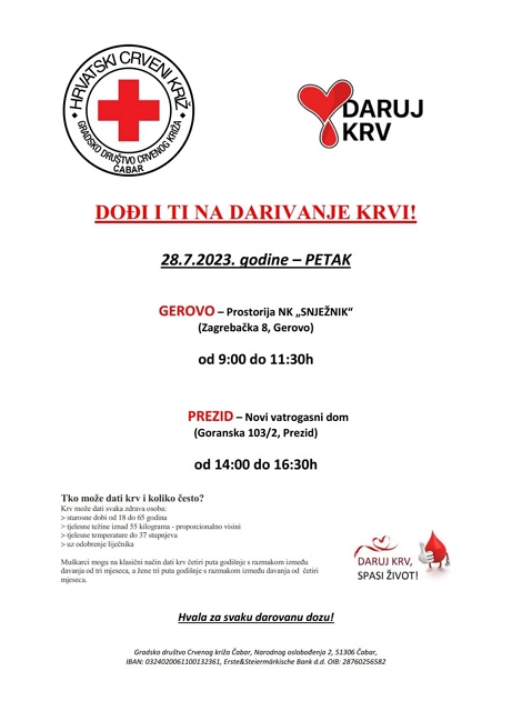 Iz čabarskog Crvenog križa najavljuju da je sljedeća akcija darivanje krvi te pozivaju dobrovoljne darivatelje da se odazovu u što većem broju, 28. srpnja u Gerovu (prostorija NK Snježnik) od 9 sati i Prezidu (novi Vatrogasni dom) od 14 sati.