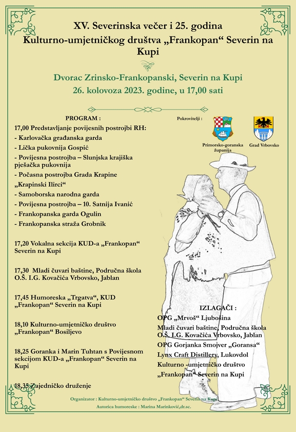 - 26. kolovoza pozivamo vas u Severin na Kupi. U perivoju Dvorca Zrinsko-frankopanskog s početkom u 17,00 sati održat će se petnaesto izdanje manifestacije „Severinska večer“ i obilježavanje 25. godina rada KUD-a „Frankopan“ Severin na Kupi. Uživajte u šarolikom programu, tradiciji, baštini i gastronomiji. Jedinstvena je prigoda biti dijelom povijesnog spektakla koji uključuje čak osam povijesnih postrojbi koje na proslavu rođendana KUD-u „Frankopan“ dolaze iz Karlovca, Gospića, Slunja, Krapine, Samobora, Ivanića, Ogulina i Grobnika. Veselimo se i opernom nastupu Goranke i Marina Tuhtana, Mladim čuvarima baštine iz Jablana, KUD-u „Frankopan“ iz Bosiljeva, izlagačima autohtonih proizvoda te našim domaćinima KUD-u „Frankopan“ iz Severina koji osim nastupa za publiku spremaju i dodatno slatko iznenađenje!