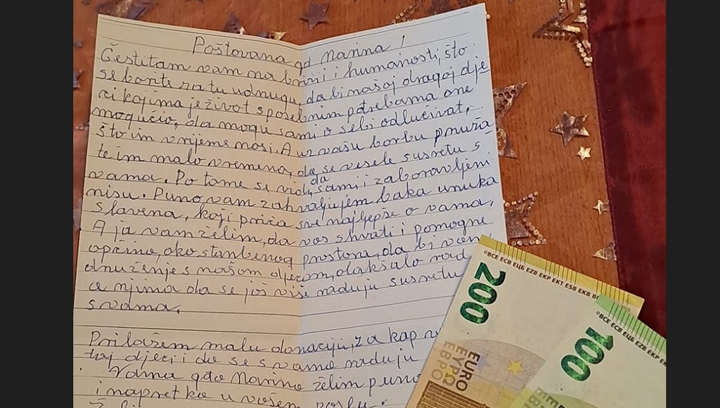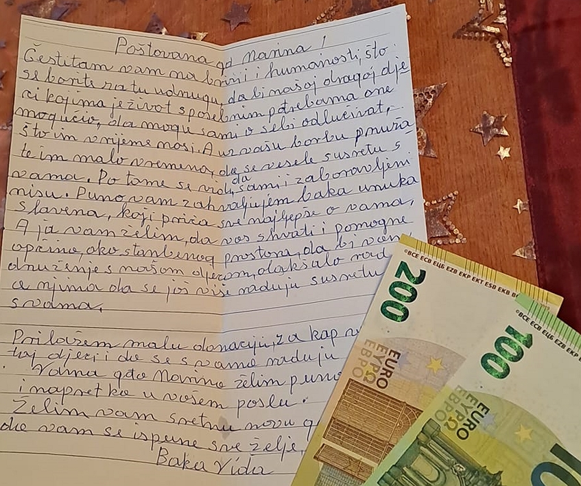 Uz pismo zahvale, naslovljeno voditeljici te udruge koja djeluje u sklopu Cross sport Delnice, Marini Miličević, 94-godišnja baka Vida iz Stare Sušice poklonila je svoju cijelu mirovinu, velikih 300 eura za rad udruge koja okuplja, pomaže i radi s mladima s poteškoćama u razvoju na delničkom području.