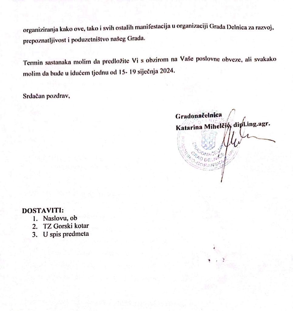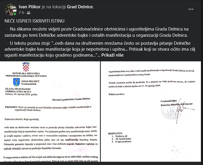 DELNICE – “…ovih dana na društvenim mrežama često se postavlja pitanje Delničke adventske bajke kao manifestacije koja je nepotrebna i upitna… Pritisak koji se stvara očito ima cilj ugasiti manifestaciju koju gradimo godinama…”dio je teksta dopisa delničke gradonačelnice Katarine Mihelčić, odaslan 10. siječnja ove godine obrtnicima i poduzetnicima Grada Delnica i to kao poziv na sastanak na temu Delničke adventske bajke i ostalih manifestacija u organizaciji Grada Delnica.