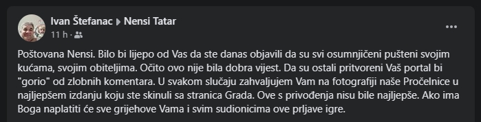 Poštovana Nensi. Bilo bi lijepo od Vas da ste danas objavili da su svi osumnjičeni pušteni svojim kućama, svojim obiteljima. Očito ovo nije bila dobra vijest. Da su ostali pritvoreni Vaš portal bi “gorio” od zlobnih komentara. U svakom slučaju zahvaljujem Vam na fotografiji naše Pročelnice u najljepšem izdanju koju ste skinuli sa stranica Grada. Ove s privođenja nisu bile najljepše. Ako ima Boga naplatiti će sve grijehove Vama i svim sudionicima ove prljave igre.