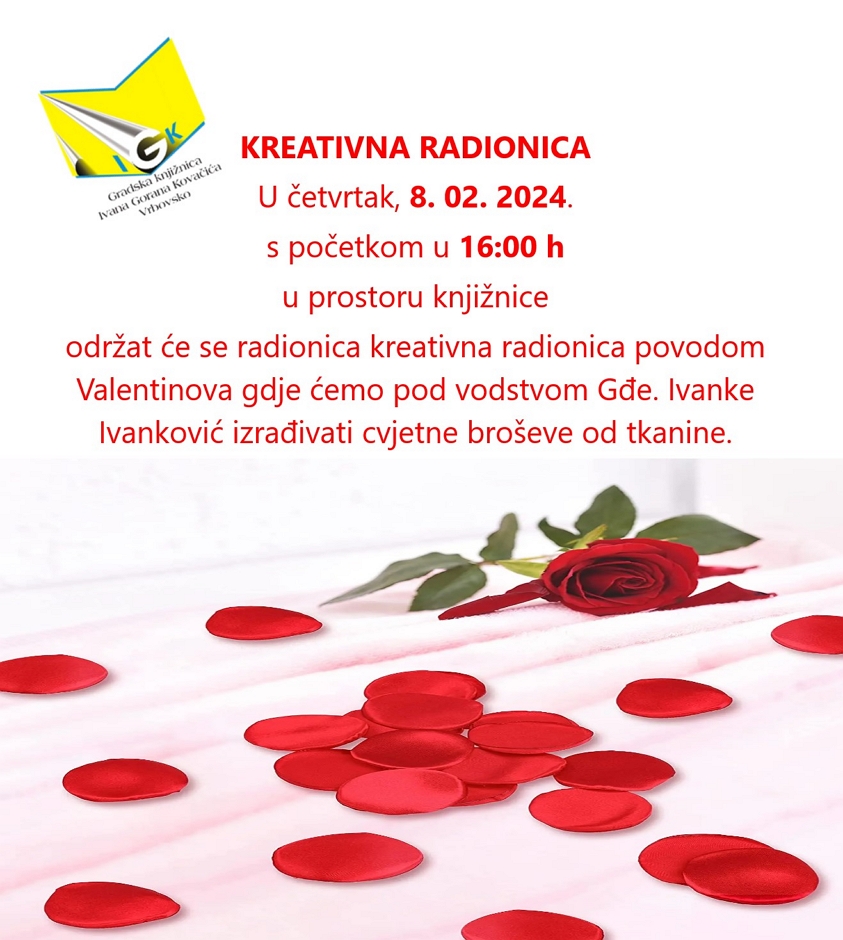Povodom Valentinova, u Gradskoj knjižnici Ivana Gorana Kovačića Vrbovsko, u četvrtak (8. veljače) održat će se kreativna radionica.
