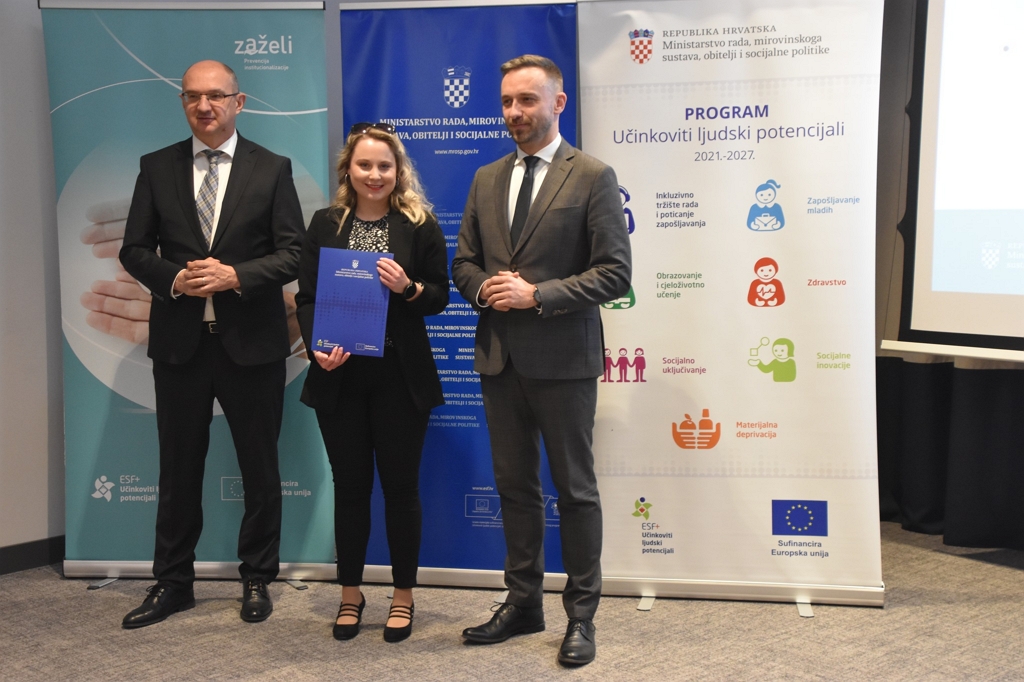Ugovor su ravnateljici Eleonori Piščević uručili Ministar rada, mirovinskog sustava, obitelji i socijalne politike Marin Piletić i Ravnatelj Hrvatskog zavoda za zapošljavanje Ante Lončar
