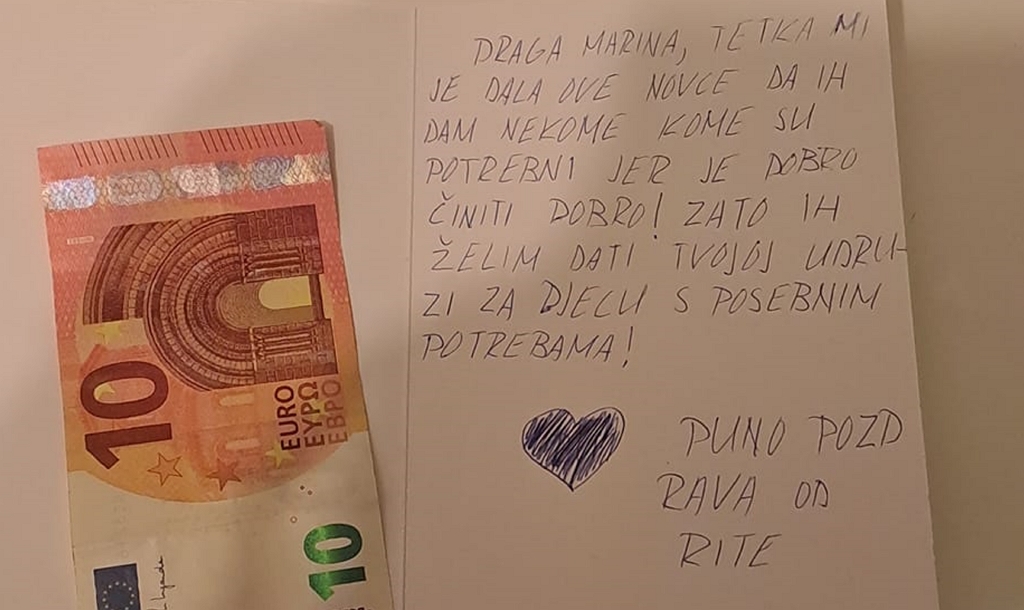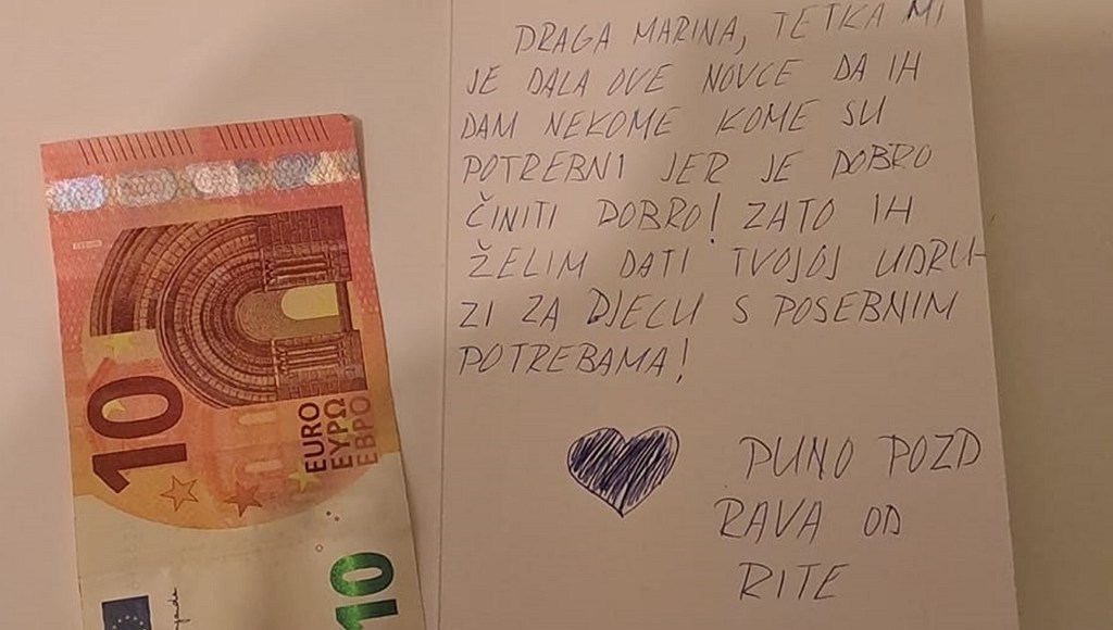 “Draga Marina, tetka mi je dala ove novce da ih dam nekome kome su potrebni jer je dobro činiti dobro! Zato ih želim dati tvojoj Udruzi za djecu s posebnim potrebama! Puno pozdrava od Rite”, stoji u pismu desetogodišnje djevojčice, uz nacrtano srce, a čije riječi otkrivaju ogromnu veličinu čovjeka u djetetu.