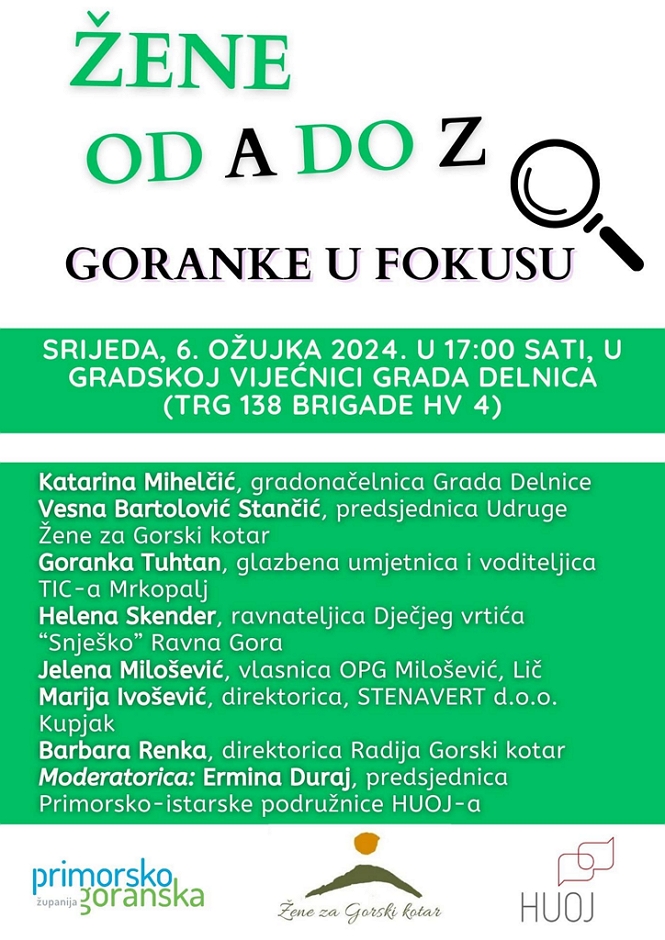 U organizaciji Primorsko-goranske županije, Hrvatske udruge za odnose s javnošću i Udruge Žene za Gorski kotar, snažne, inspirativne i uspješne Goranke pričat će o temama od A do Z., a okupit će se u Gradskoj vijećnici Grada Delnice (Trg 138. brigade HV 4).