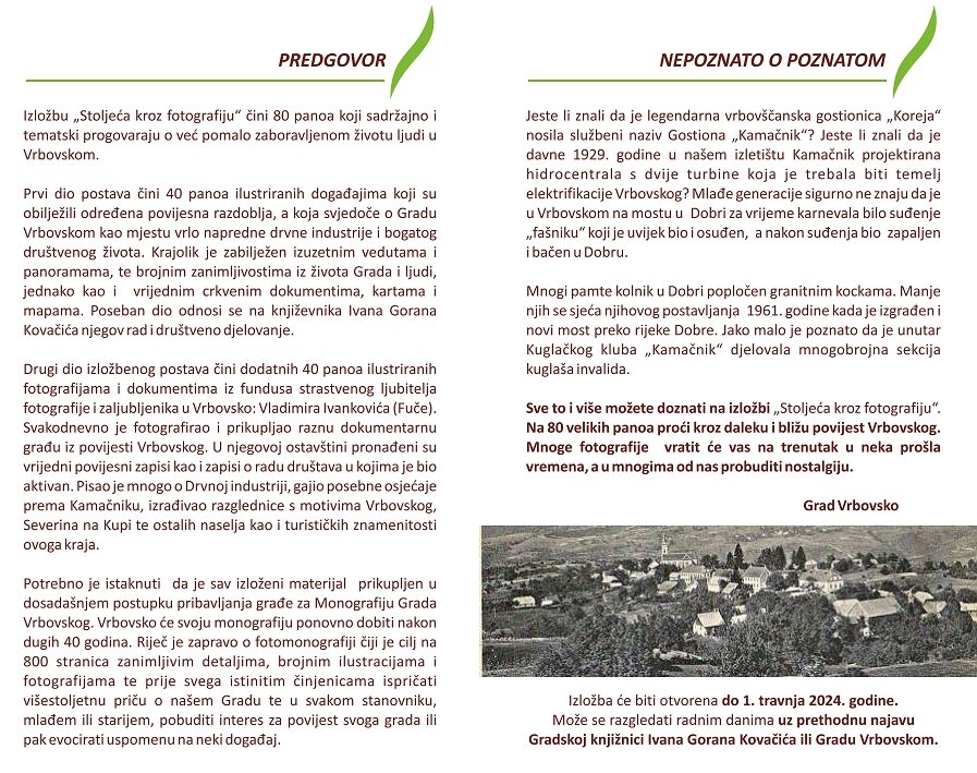 “Koji je službeni naziv bio legendarne vrboščanske gostionice „Koreja“, što je davne 1929. godine u izletištu Kamačnik projektirano, gdje je bilo centralno mjesto karnevalskog spaljivanja pusta, kada je izgrađen novi most preko Dobre…samo su neke od povijesnih zanimljivosti koje možete saznati na izložbi „Stoljeća kroz fotografiju“, a koju možete razgledati u Izložbenom prostoru Grada Vrbovskog ( I.G.Kovačića 44).