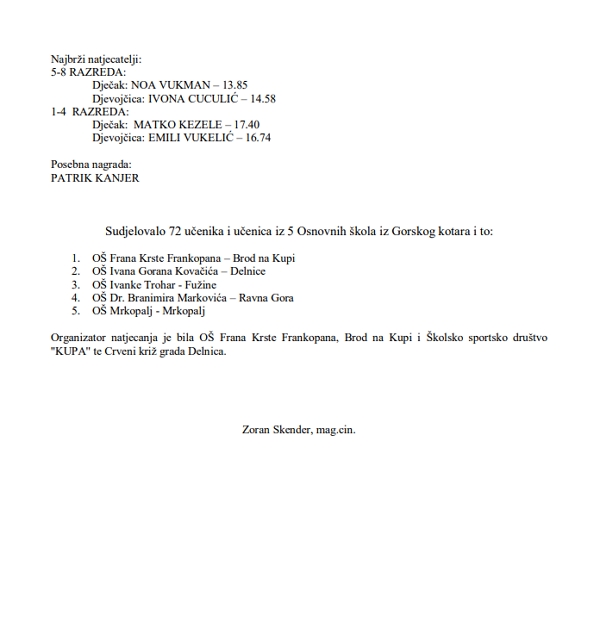 Na prvenstvu održanom u Sportskoj dvorani u Delnicama, natjecalo se čak 72 učenika od prvog do osmog razreda iz 5 osnovnih goranskih škola (Brod na Kupi, Delnice, Fužine, Ravna Gora i Mrkopalj).