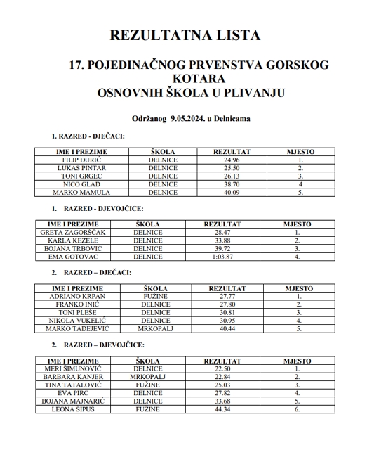 Na proglašenju pobjednika i dodjeli medalja najuspješnijim plivačicama i plivačima po razrednim kategorijama (u nastavku teksta rezultatna lista), najbržim natjecateljima su proglašeni, Noa Vukman i Ivona Cuculić (od 5. – 8. razreda) te Matko Kezele i Emili Vukelić (od 1. – 4. razreda), a posebnu nagradu dobio je Patrik Kanjer.