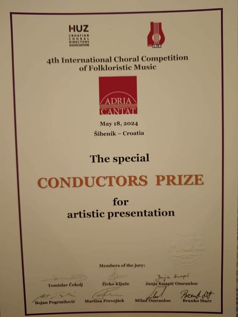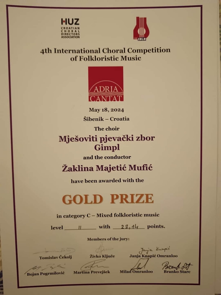 MPZ Gimpl je žiri ocijenio najvišom ocjenom i zlato im dodijelio u C kategoriji/hrvatski i strani folklore, a njihovoj dirigentici Žaklini Majetić dodijelio posebnu nagradu.
