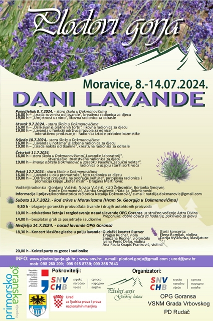 Održat će se niz muzičkih i likovnih radionica, edukativna predavanja, šetnje nasadima lavandi, koncerti u polju lavande i prezentacija goranskih proizvođača lavande i drugih autohtonih proizvoda.