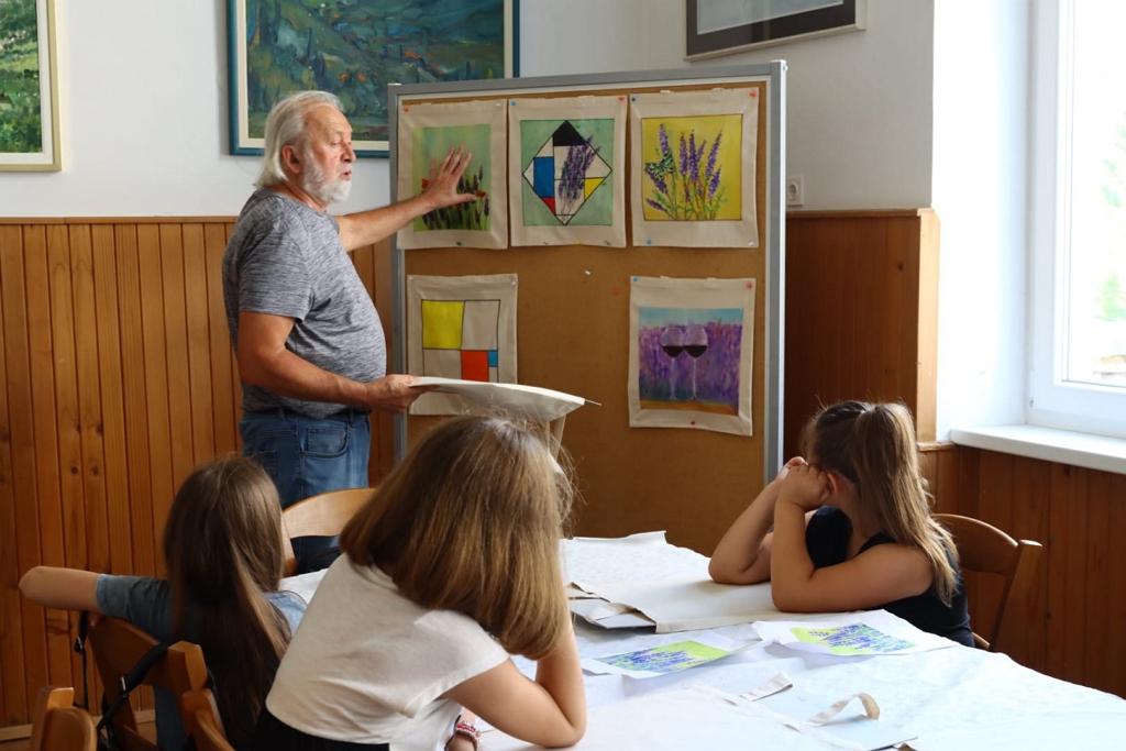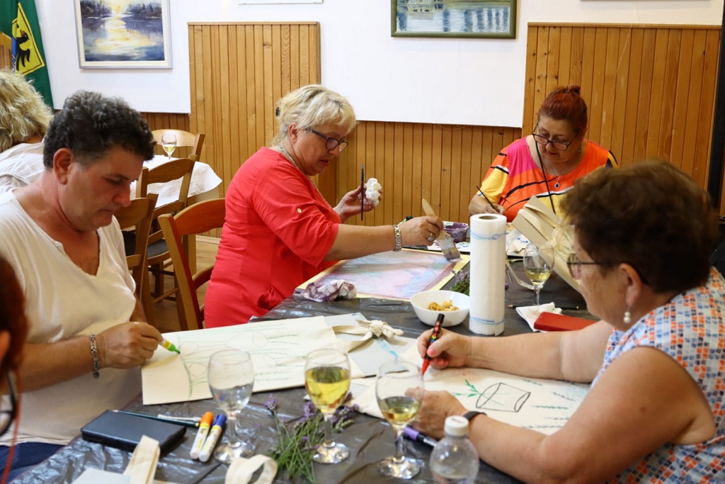 Druga radionica prvog dana festivala bila je za odrasle pod vodstvom prof. Novice Vučinića. Mnogobrojne dame (i jedan gospodin) okušali su se u oslikavanju motiva polja lavande, ili nečega proizvoljnog, uz opuštajuću atmosferu i vino. Vrlo popularna radionica Art & wine, upravo je na našem području i krenula s našeg festivala. Također, na ovoj radionici su nastala zanimljiva i jedinstvena umjetnička djela, a svatko je svoj rad nakon kratke izložbe ponio kući.