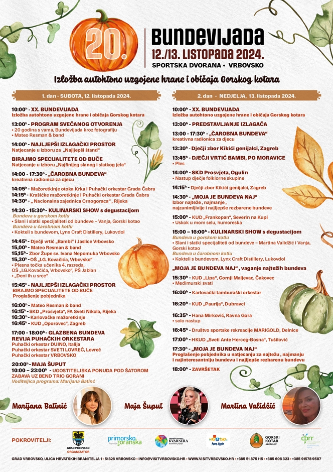 Dragi posjetioci Bundevijada u Vrbovskom slavi 20. rođendan! I ove godine moći ćete uživati u kupnji bundeva, bučinog ulja, proizvoda od bundeve te ostalih eko-etno proizvoda, kulturno-umjetničkom programu, predstavljanju starinskih i nesvakidašnjih jela, izboru za najmanju , najinteresantniju i najtežu bundevu, natjecanju za najljepši izlagački prostor te bogatoj gastronomskoj ponudi.