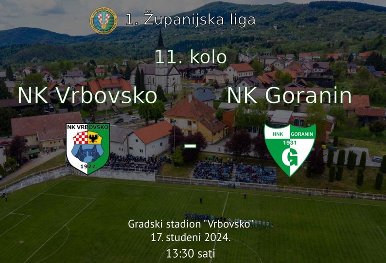 Utakmica je to 11. kola, 1. županijske lige, koju ugošćuje NK Vrbovsko, a igra protiv NK Goranin, u nedjelju (17. studenog), na Gradskom stadionu Vrbovsko s početkom u 13:30 sati.