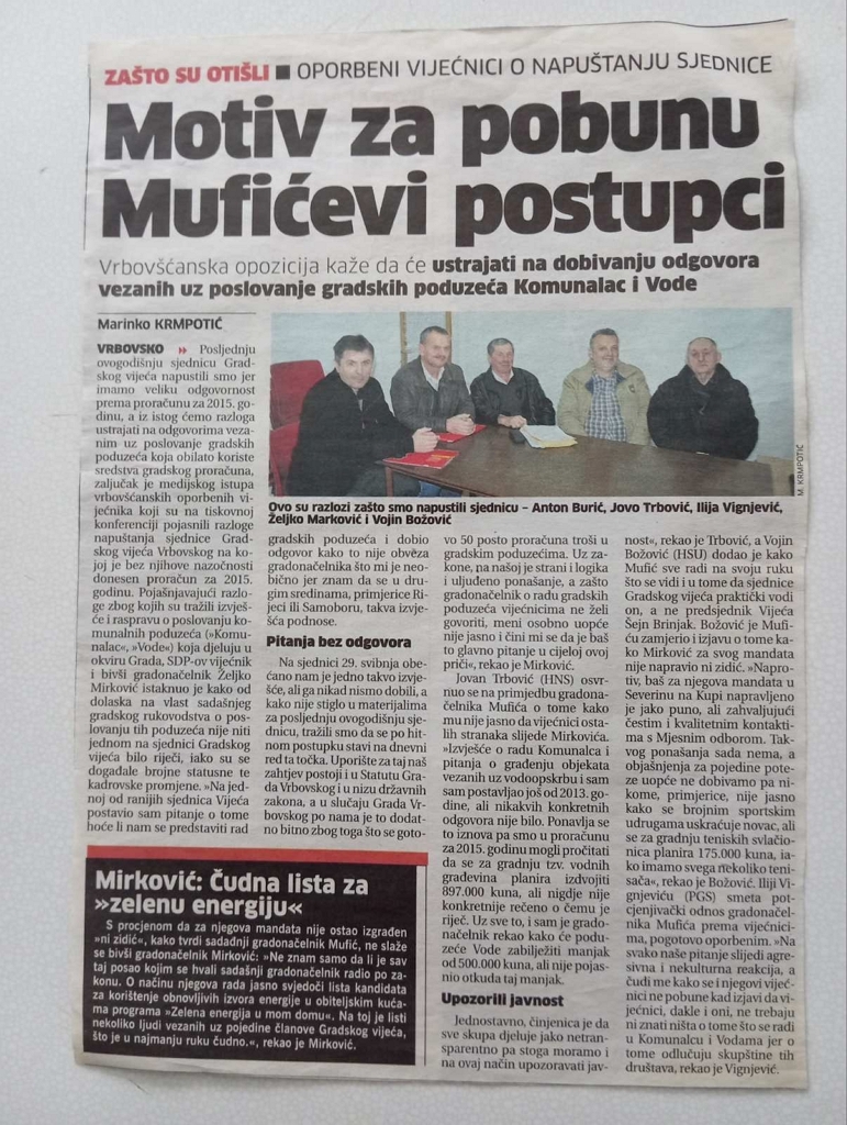 Vijećnici Gradskog vijeća iz redova SDP-a, Saša Burić, Gordana Gerić Paulić i Jovan Trbović napustili su posljednju sjednicu Gradskog Vijeća Grada Vrbovskog, zbog opetovanog ružnog i neprimjerenog ponašanja gradonačelnika Mufića, ali i propusta u vođenju sjednice od strane predsjednice Vijeća koja je dopustila takvo ponašanje gradonačelnika.
