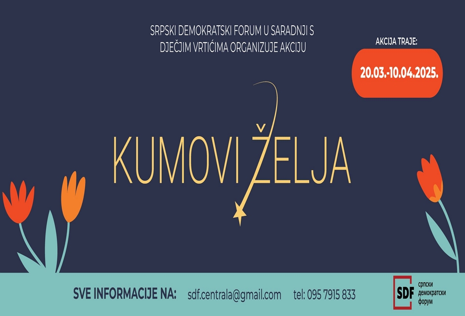 Pozivamo sve ljude dobre volje, fizičke i pravne osobe da se uključe u akciju kako bi ispunili želje naših mališana. Postanite kum ili kuma dječjih želja i obradujte mališane sa područja Grada Vrbovskog za Uskrs, stoji u pozivu Srpskog demokratskog foruma u kojem ističu da je akcija već započela i traje do 10. travnja.