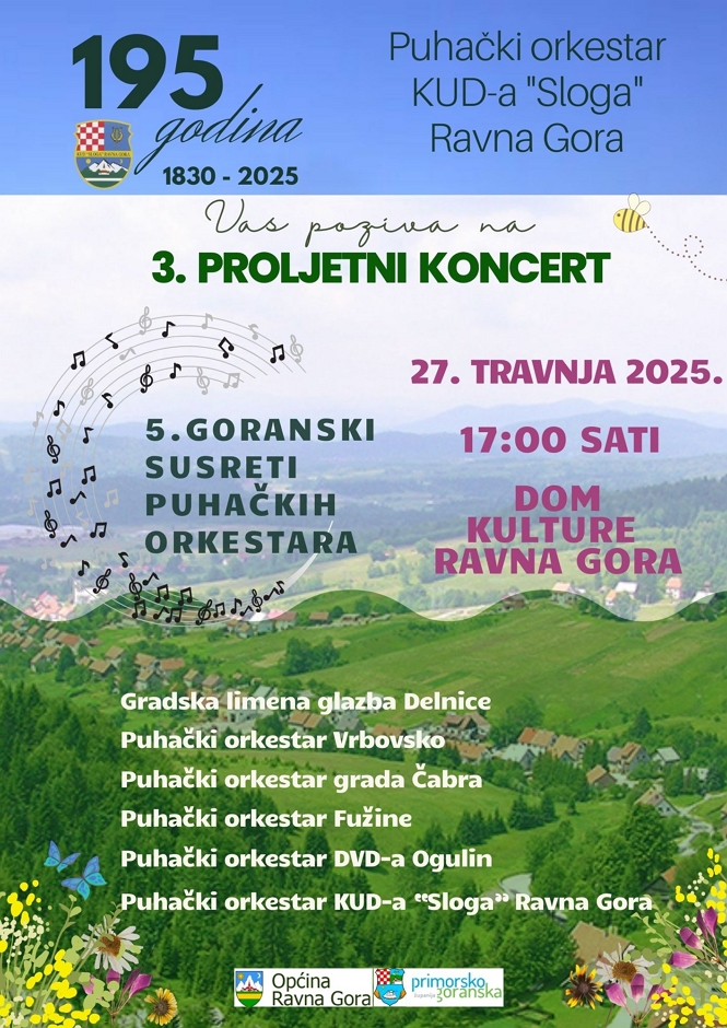 RAVNA GORA – KUD „Sloga“ Ravna Gora ovu nedjelju (27. travnja) poziva sve ljubitelje limene glazbe, na svoj 3. proljetni koncert, kojim će proslaviti veliku obljetnicu – 195 godina djelovanja.