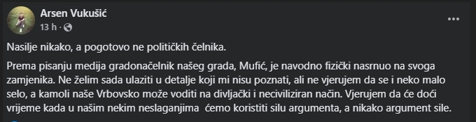 Prema pisanju medija gradonačelnik našeg grada, Mufić, je navodno fizički nasrnuo na svoga zamjenika. Ne želim sada ulaziti u detalje koji mi nisu poznati, ali ne vjerujem da se i neko malo selo, a kamoli naše Vrbovsko može voditi na divljački i neciviliziran način. Vjerujem da će doći vrijeme kada u našim nekim neslaganjima ćemo koristiti silu argumenta, a nikako argument sile.