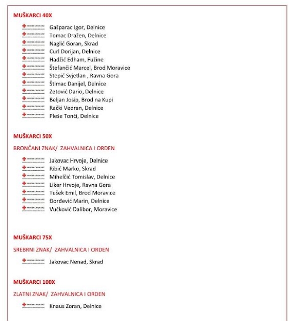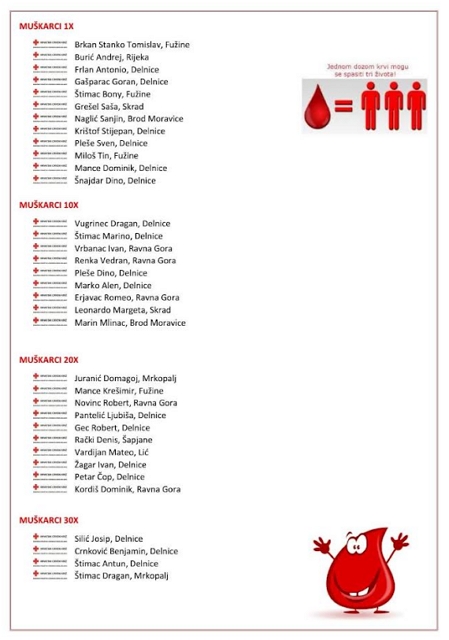 Ove godine Zlatni znak/ zahvalnicu i orden za 100 darivanja krvi dobio je Zoran Knaus iz Delnica, Srebrni znak za 75 darivanja krvi uručen je Nenadu Jakovcu iz Skrada, a Brončani znak za 50 darivanja krvi dobilo je sedam goranskih darivatelja – Hrvoje Jakovac (Delnice), Marko Ribić (Skrad), Tomislav Mihelčić (Delnice), Hrvoje Liker (Ravna Gora), Emil Tušek (Brod Moravice), Marin Đorđević (Delnice) i Dalibor Vučković (Moravice).
