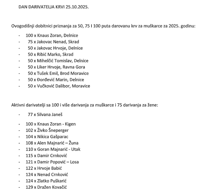 U 2024. godini organizirali smo 18 akcija dobrovoljnog darivanja krvi, kojima je pristupilo 1046 darivatelja/ica, od toga 878 muškaraca i 168 žena. Prikupili smo 984 doza krvi, 838 doza su darovali muškarci, a žene 146, istaknula je Krizmanić dodavši da im je izuzetno drago što se tijekom svih akcija odaziva veliki broj mladih ljudi, da se kontinuitet odazvanih osoba nastavlja te povećava broj stalnih mladih darivatelja kao i darivateljica što, zaključuje Krizmanić, ukazuje na održivost i očuvanje tradicije darivanja krvi u goranskom kraju.